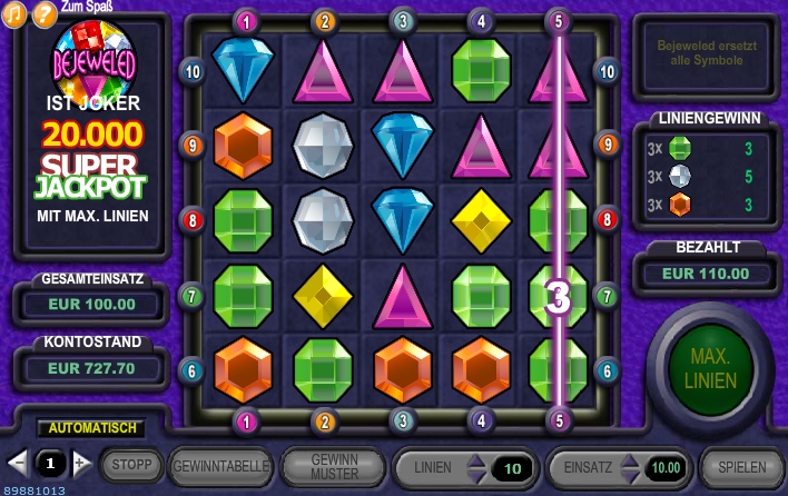 Vor dir befinden sich nämlich keine Gewinnwalzen, sondern reihenweise Juwelen, die immer dann entfernt werden, wenn mehrere der gleichen Farbe in einer Gewinnreihe erscheinen. Schon rücken neue Juwelen nach, die dich mit ein wenig Glück bereichern können.