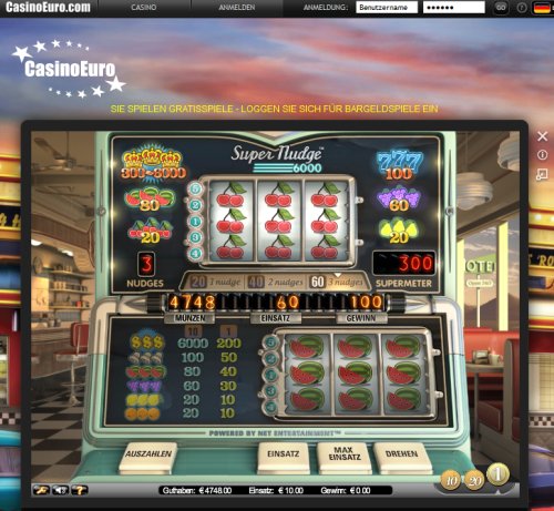 Nach einer kostenlosen Anmeldung im Casino Euro kann der Kampf ums große Geld beginnen. Super Nudge 6000 ist bietet seinen Spielern zahlreiche Einstellungsmöglichkeiten, die zunächst ausgewählt werden müssen. Das Einstellen des Münzwertes und die Auswahl der Gewinnreihen sollte den meisten Spielern bereits aus anderen Spielautomaten bekannt sein. Schon mit einem Einsatz von einem Cent pro Gewinnlinie hat jeder die Chance auf satte Gewinne.